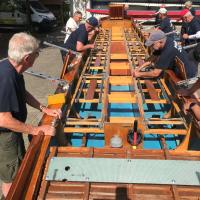 Der Sonntag war der letzte Tag der Fahrt und so wurde die Barke an der Rampe am Biergarten in Marktheidenfeld aus dem Wasser geholt und zum Putzen auf das Gelände der RGM gebracht. Unser Wanderruder-Betreuer Stef Dürrnagel empfing die Männer und zeigte allen, wo was zu finden ist. Er bewirtete die Mannschaft und so konnte ein schöner Abschluss in der Friedrichsruh gestaltet werden.